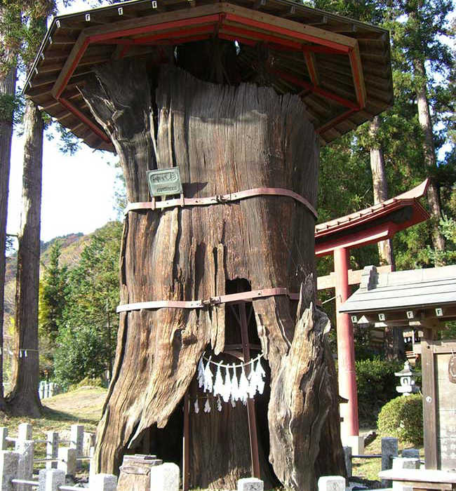 本武尊のお手植えによるものと言い伝えられ、樹齢1400年といわれていますが、天明の頃、火災にあって今は高さ6m、根本周り10m、厚さ45cmの枯木となっています。中の空洞に生えた杉は樹齢250年。別名親子杉とも呼ばれています。