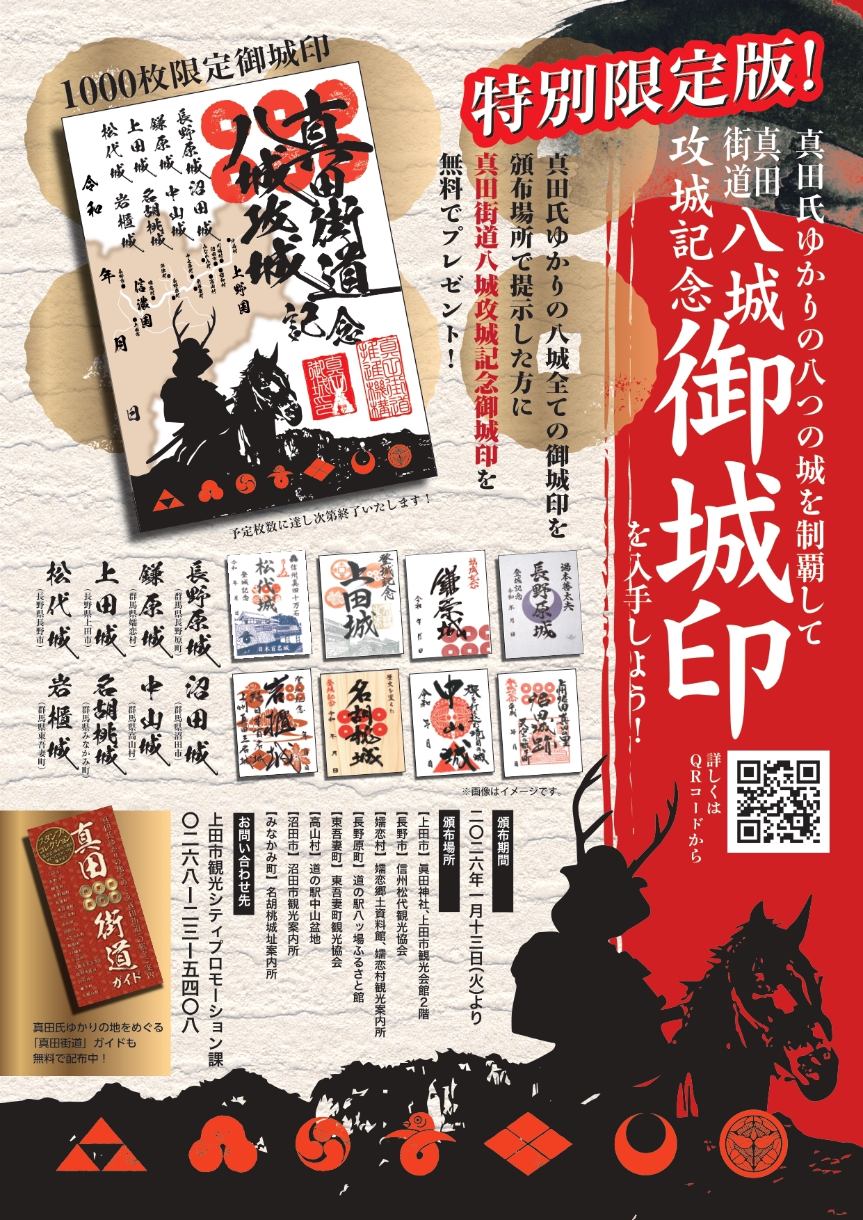 真田氏ゆかりの八城それぞれに御城印があります。令和8年1月13日から、それら八城すべての御城印を集めて提示された方を対象に、「真田街道八城攻城記念御城印」を無料で頒布しています。御城印マニアにはたまらない激レアアイテムです!(限定1,000枚です)